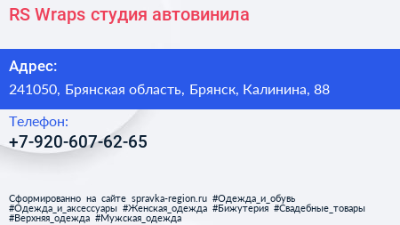 RS Wraps, студия автовинила по адресу 241050, Брянская область, Брянск, Калинина, 88 в дальнейшем Организация, размещена в следующих категориях: