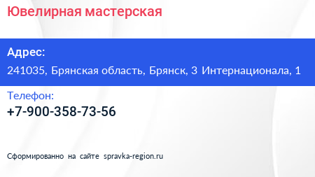 Ювелирная мастерская по адресу 241035, Брянская область, Брянск, 3 Интернационала, 1 в дальнейшем Организация, размещена в следующих категориях: