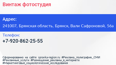 Винтаж, фотостудия по адресу 241007, Брянская область, Брянск, Вали Сафроновой, 56а в дальнейшем Организация, размещена в следующих категориях: