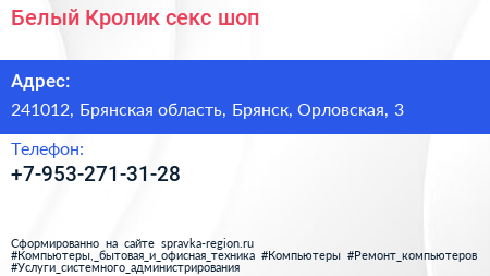 Белый Кролик, секс-шоп по адресу 241012, Брянская область, Брянск, Орловская, 3 в дальнейшем Организация, размещена в следующих категориях: