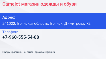 Camelot, магазин одежды и обуви по адресу 241022, Брянская область, Брянск, Димитрова, 72 в дальнейшем Организация, размещена в следующих категориях: