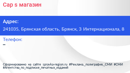 Cap`s, магазин по адресу 241035, Брянская область, Брянск, 3 Интернационала, 8 в дальнейшем Организация, размещена в следующих категориях: