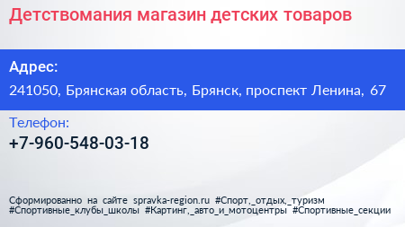 Детствомания, магазин детских товаров по адресу 241050, Брянская область, Брянск, проспект Ленина, 67 в дальнейшем Организация, размещена в следующих категориях: