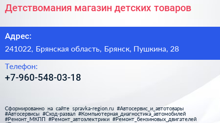 Детствомания, магазин детских товаров по адресу 241022, Брянская область, Брянск, Пушкина, 28 в дальнейшем Организация, размещена в следующих категориях: