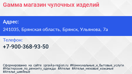 Gамма, магазин чулочных изделий по адресу 241035, Брянская область, Брянск, Ульянова, 7а в дальнейшем Организация, размещена в следующих категориях: