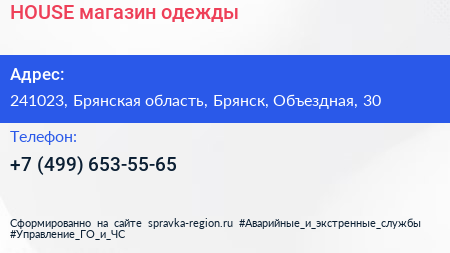 HOUSE, магазин одежды по адресу 241023, Брянская область, Брянск, Объездная, 30 в дальнейшем Организация, размещена в следующих категориях: