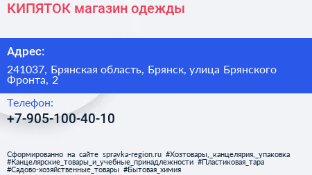 КИПЯТОК, магазин одежды по адресу 241037, Брянская область, Брянск, улица Брянского Фронта, 2 в дальнейшем Организация, размещена в следующих категориях: