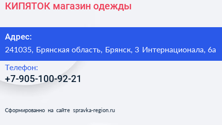 КИПЯТОК, магазин одежды по адресу 241035, Брянская область, Брянск, 3 Интернационала, 6а в дальнейшем Организация, размещена в следующих категориях: