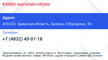 Keddo, магазин обуви по адресу 241023, Брянская область, Брянск, Объездная, 30 в дальнейшем Организация, размещена в следующих категориях:
