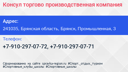 Консул, торгово-производственная компания по адресу 241035, Брянская область, Брянск, Промышленная, 3 в дальнейшем Организация, размещена в следующих категориях: