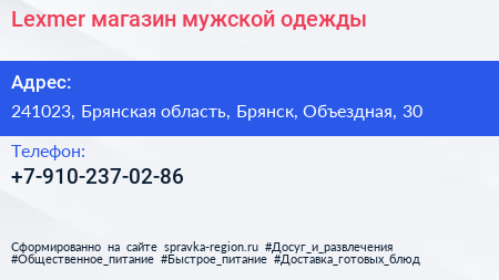 Lexmer, магазин мужской одежды по адресу 241023, Брянская область, Брянск, Объездная, 30 в дальнейшем Организация, размещена в следующих категориях: