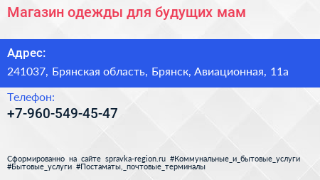 Магазин одежды для будущих мам по адресу 241037, Брянская область, Брянск, Авиационная, 11а в дальнейшем Организация, размещена в следующих категориях:
