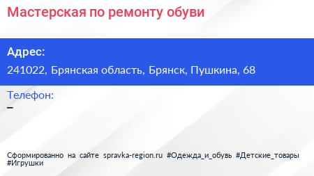 Мастерская по ремонту обуви по адресу 241022, Брянская область, Брянск, Пушкина, 68 в дальнейшем Организация, размещена в следующих категориях: