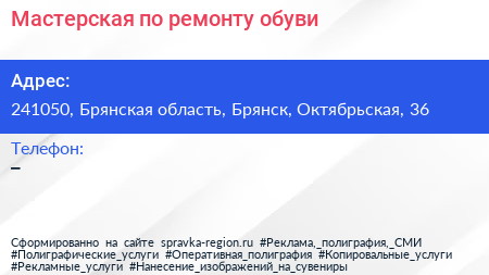 Мастерская по ремонту обуви по адресу 241050, Брянская область, Брянск, Октябрьская, 36 в дальнейшем Организация, размещена в следующих категориях: