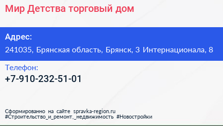 Мир Детства, торговый дом по адресу 241035, Брянская область, Брянск, 3 Интернационала, 8 в дальнейшем Организация, размещена в следующих категориях: