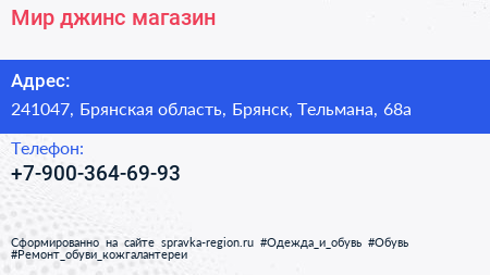 Мир джинс, магазин по адресу 241047, Брянская область, Брянск, Тельмана, 68а в дальнейшем Организация, размещена в следующих категориях: