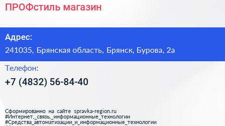 ПРОФстиль, магазин по адресу 241035, Брянская область, Брянск, Бурова, 2а в дальнейшем Организация, размещена в следующих категориях: