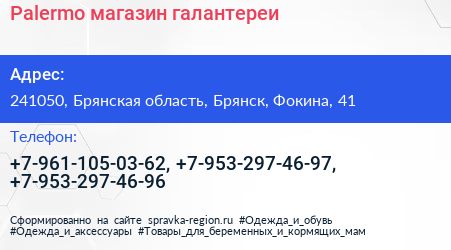 Palermo, магазин галантереи по адресу 241050, Брянская область, Брянск, Фокина, 41 в дальнейшем Организация, размещена в следующих категориях: