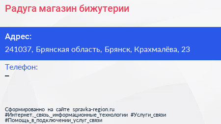 Радуга, магазин бижутерии по адресу 241037, Брянская область, Брянск, Крахмалёва, 23 в дальнейшем Организация, размещена в следующих категориях: