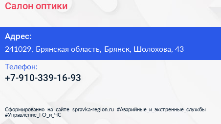Салон оптики по адресу 241029, Брянская область, Брянск, Шолохова, 43 в дальнейшем Организация, размещена в следующих категориях: