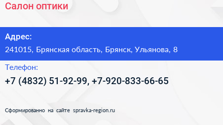 Салон оптики по адресу 241015, Брянская область, Брянск, Ульянова, 8 в дальнейшем Организация, размещена в следующих категориях: