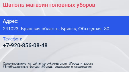 Шапэль, магазин головных уборов по адресу 241023, Брянская область, Брянск, Объездная, 30 в дальнейшем Организация, размещена в следующих категориях: