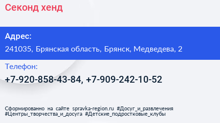 Секонд-хенд по адресу 241035, Брянская область, Брянск, Медведева, 2 в дальнейшем Организация, размещена в следующих категориях:
