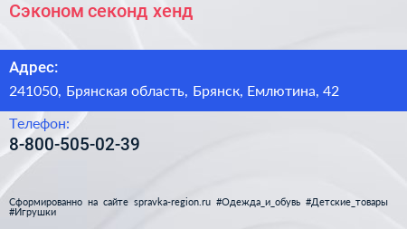 Сэконом, секонд-хенд по адресу 241050, Брянская область, Брянск, Емлютина, 42 в дальнейшем Организация, размещена в следующих категориях: