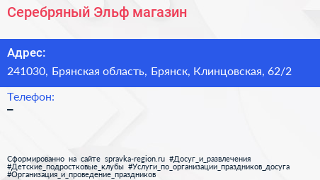 Серебряный Эльф, магазин по адресу 241030, Брянская область, Брянск, Клинцовская, 62/2 в дальнейшем Организация, размещена в следующих категориях: