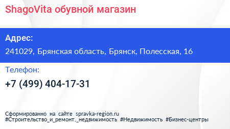 ShagoVita, обувной магазин по адресу 241029, Брянская область, Брянск, Полесская, 16 в дальнейшем Организация, размещена в следующих категориях: