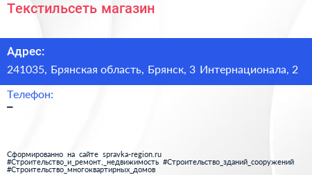 Текстильсеть, магазин по адресу 241035, Брянская область, Брянск, 3 Интернационала, 2 в дальнейшем Организация, размещена в следующих категориях: