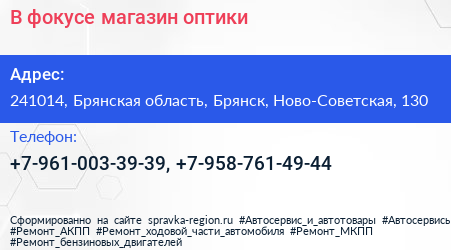 В фокусе, магазин оптики по адресу 241014, Брянская область, Брянск, Ново-Советская, 130 в дальнейшем Организация, размещена в следующих категориях: