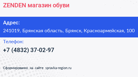ZENDEN, магазин обуви по адресу 241019, Брянская область, Брянск, Красноармейская, 100 в дальнейшем Организация, размещена в следующих категориях: