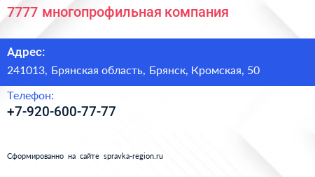 7777, многопрофильная компания по адресу 241013, Брянская область, Брянск, Кромская, 50 в дальнейшем Организация, размещена в следующих категориях: