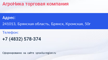 АгроНика, торговая компания по адресу 241013, Брянская область, Брянск, Кромская, 50г в дальнейшем Организация, размещена в следующих категориях: