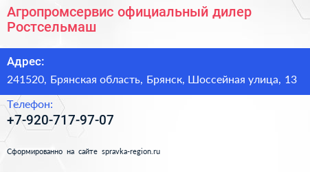 Агропромсервис, официальный дилер Ростсельмаш по адресу 241520, Брянская область, Брянск, Шоссейная улица, 13 в дальнейшем Организация, размещена в следующих категориях: