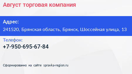 Август, торговая компания по адресу 241520, Брянская область, Брянск, Шоссейная улица, 13 в дальнейшем Организация, размещена в следующих категориях: