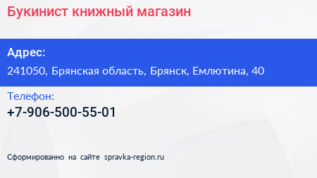 Букинист, книжный магазин по адресу 241050, Брянская область, Брянск, Емлютина, 40 в дальнейшем Организация, размещена в следующих категориях: