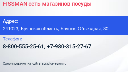 FISSMAN, сеть магазинов посуды по адресу 241023, Брянская область, Брянск, Объездная, 30 в дальнейшем Организация, размещена в следующих категориях: