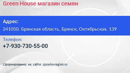 Green House, магазин семян по адресу 241050, Брянская область, Брянск, Октябрьская, 139 в дальнейшем Организация, размещена в следующих категориях:
