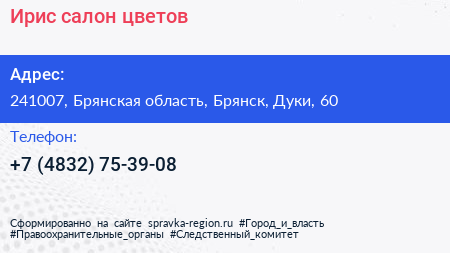 Ирис, салон цветов по адресу 241007, Брянская область, Брянск, Дуки, 60 в дальнейшем Организация, размещена в следующих категориях: