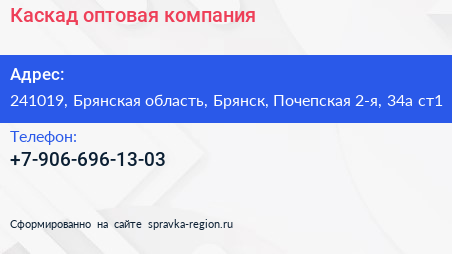 Каскад, оптовая компания по адресу 241019, Брянская область, Брянск, Почепская 2-я, 34а ст1 в дальнейшем Организация, размещена в следующих категориях: