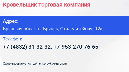Кровельщик, торговая компания по адресу Брянская область, Брянск, Сталелитейная, 12а в дальнейшем Организация, размещена в следующих категориях: