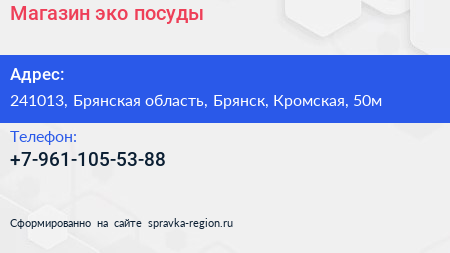 Магазин эко посуды по адресу 241013, Брянская область, Брянск, Кромская, 50м в дальнейшем Организация, размещена в следующих категориях: