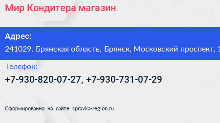 Мир Кондитера, магазин по адресу 241029, Брянская область, Брянск, Московский проспект, 1 в дальнейшем Организация, размещена в следующих категориях: