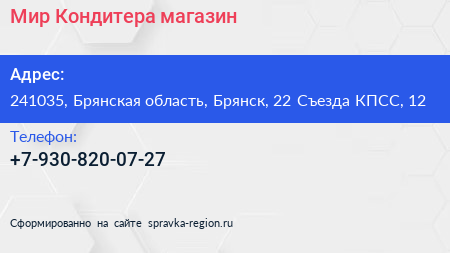 Мир Кондитера, магазин по адресу 241035, Брянская область, Брянск, 22 Съезда КПСС, 12 в дальнейшем Организация, размещена в следующих категориях: