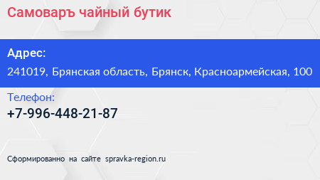 Самоваръ, чайный бутик по адресу 241019, Брянская область, Брянск, Красноармейская, 100 в дальнейшем Организация, размещена в следующих категориях: