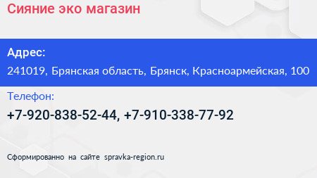 Сияние, эко-магазин по адресу 241019, Брянская область, Брянск, Красноармейская, 100 в дальнейшем Организация, размещена в следующих категориях:
