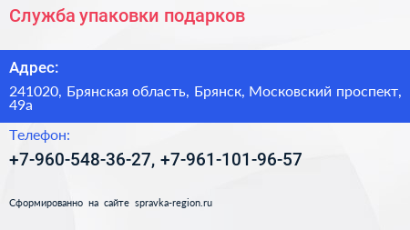 Служба упаковки подарков по адресу 241020, Брянская область, Брянск, Московский проспект, 49а в дальнейшем Организация, размещена в следующих категориях: