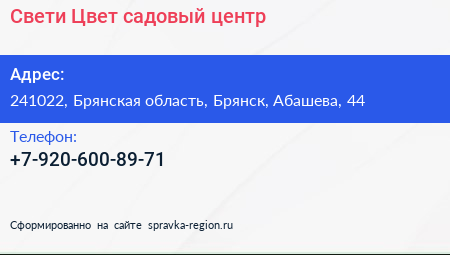 Свети-Цвет, садовый центр по адресу 241022, Брянская область, Брянск, Абашева, 44 в дальнейшем Организация, размещена в следующих категориях: